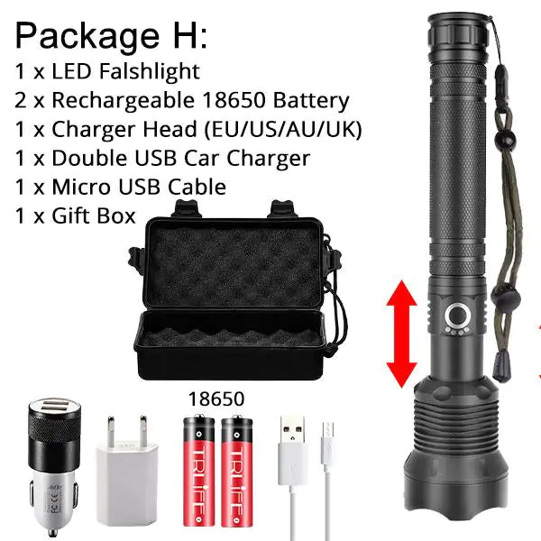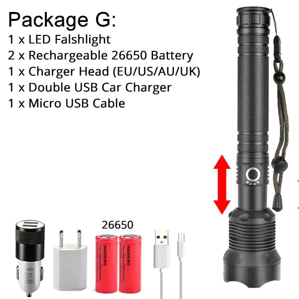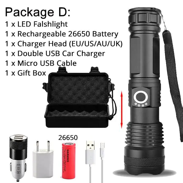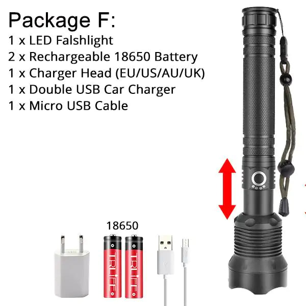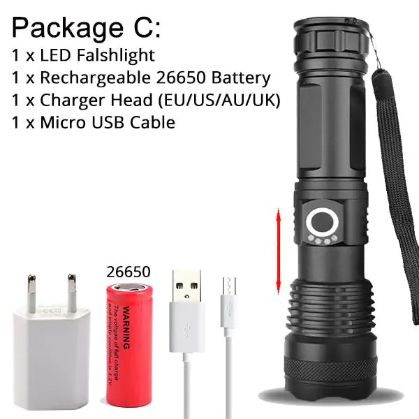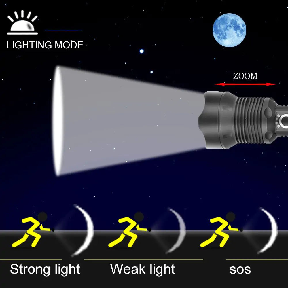The XHP flashlights feature cutting-edge LED 4-grid lamp beads, providing intense spotlighting and a wider floodlight range, surpassing even car headlights in brightness. Rigorously tested for quality assurance, these flashlights are primed for various outdoor applications, ensuring reliability when you need it most.